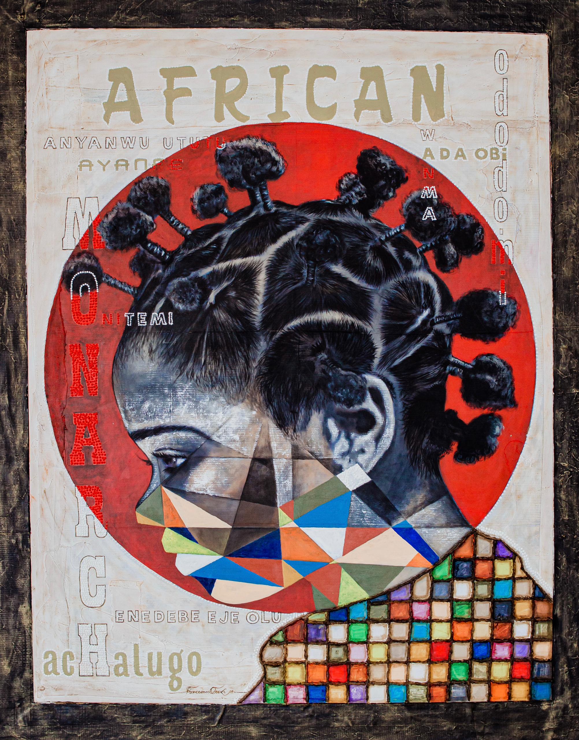 Diary of Beauty Part 2″ celebrates the radiant beauty of African womanhood. This vibrant mixed media artwork embodies the essence of a strong, resilient woman, adorned with intricate Chuku hairstyles that symbolize cultural heritage.