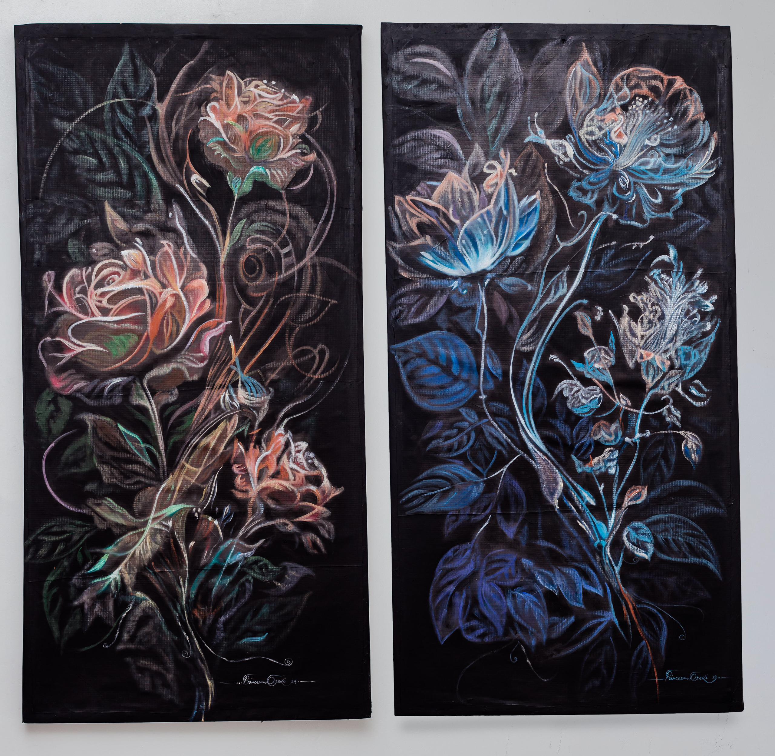 Soul Mate is a twin collection abstract that explores the essence of the soul through vibrant, floral elements. The burnt orange and blueish hues evoke the warmth and depth of human connection, symbolizing the union of two souls.